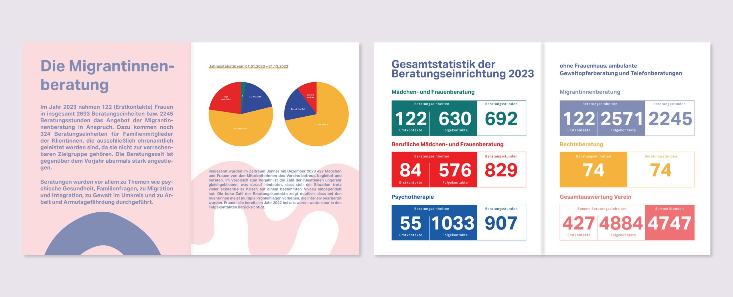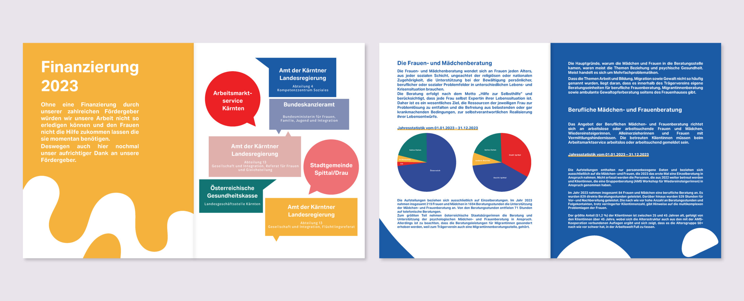 Für das Frauenhaus Spittal haben wir bereits zweimal den Jahresbericht gelayoutet. Die Herausforderung bestand darin, die zusammengefassten Zahlen und Fakten der Institution ansprechend und übersichtlich zu gestalten. Wir haben ein modernes Design entwickelt, das nicht nur die wichtigsten Informationen hervorhebt, sondern auch visuell ansprechend ist. Die Auftraggeber ließen uns dabei viel kreative Freiheit, dadurch konnten wir mit Farben, Grafiken und Formen experimentieren.